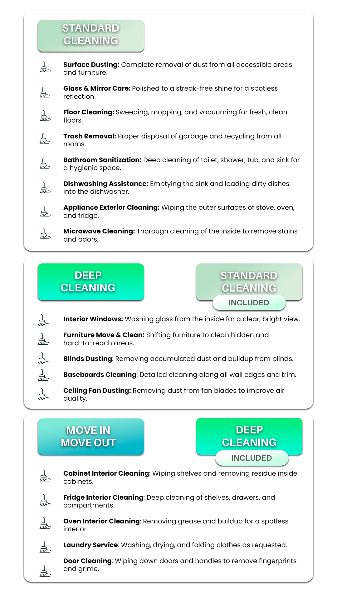 Our team is fully trained, insured, and dedicated to providing exceptional results every time. From routine house cleaning to deep cleaning, move-in/move-out services, and commercial maintenance, we adapt each service to your specific needs.